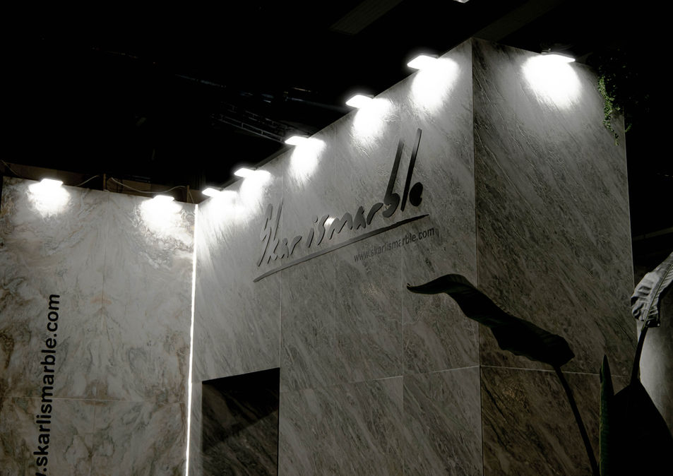 L’imponenza dell’allestimento — con volumi slanciati e altezze importanti — richiama l’idea stessa della cava, delle pareti rocciose scolpite dal lavoro dell’uomo, e trasmette la solidità e l’autenticità che da sempre contraddistinguono Skarlis Marble.